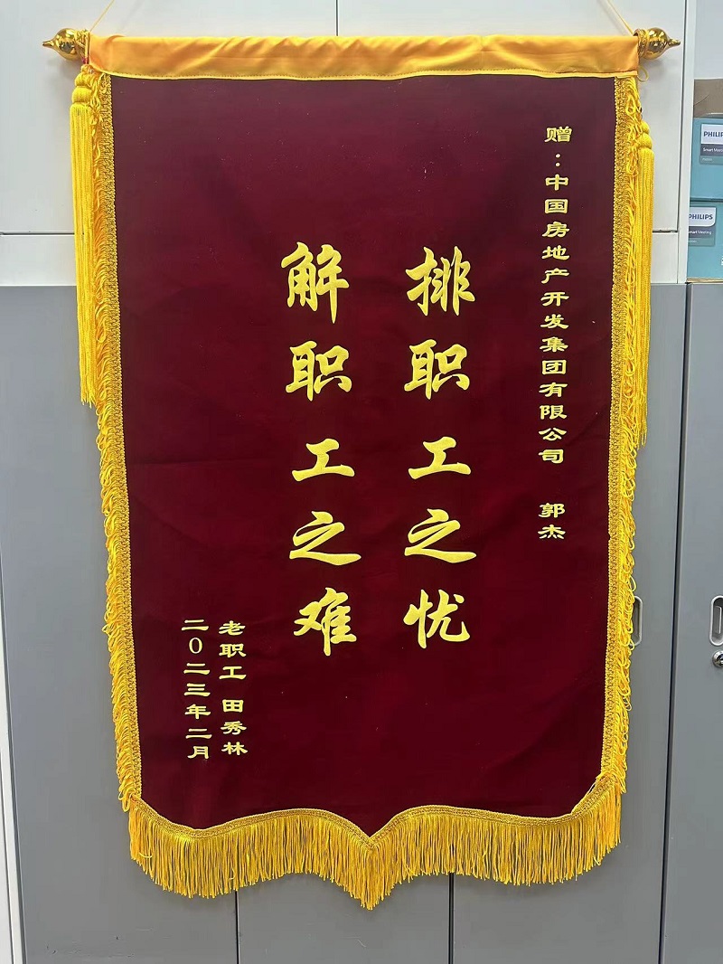 近日,中房集團收到一面印著“排職工之憂,解職工之難”的錦旗。老職工田女士對綜合辦公室(黨委辦公室)郭杰同志在歷史遺留房產問題解決過程中展現的專業、盡職和熱情幫助表達了誠摯謝意。
