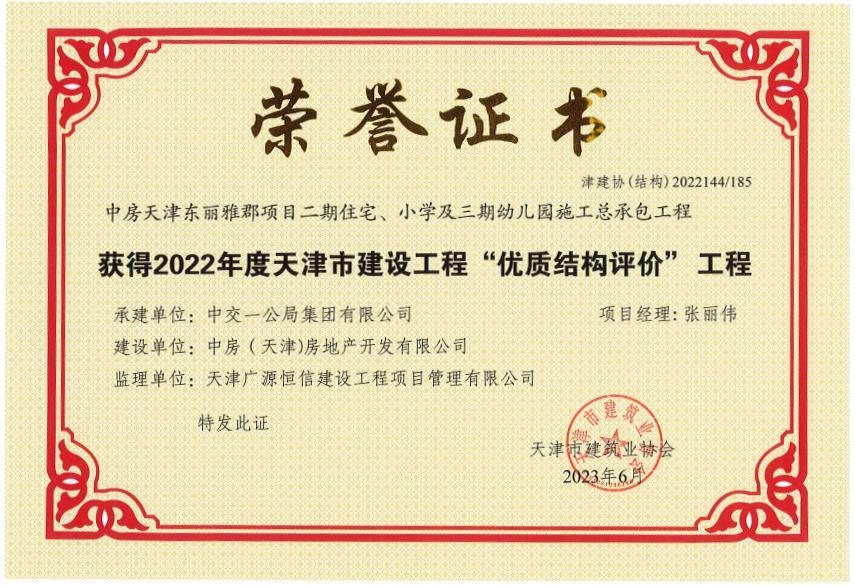 “優(yōu)質(zhì)結(jié)構(gòu)評價(jià)”工程是天津市建設(shè)工程結(jié)構(gòu)質(zhì)量的最高榮譽(yù)獎(jiǎng),獲此獎(jiǎng)項(xiàng)表明東麗雅郡項(xiàng)目二期在工程質(zhì)量、安全生產(chǎn)、現(xiàn)場文明施工和施工管理等方面均達(dá)到先進(jìn)水平。